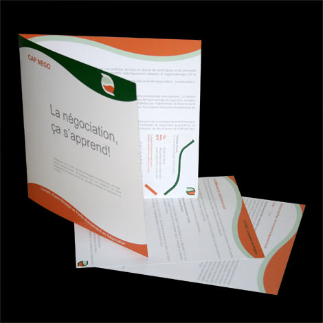 4 pages brochure with holes for the business card + the business card itself + 2 individual sheets, made with Indesign and Illustrator for Cap Négo, formation institute of one person, specialised in negotiation. One of my very first experiences as a freelancer, first noticeable professional experience in the print graphic design field, which proved successful. Layout, graphic design, logo and branding rules creation, seeking of the best value for money print company, for the amount of brochures requested (600).